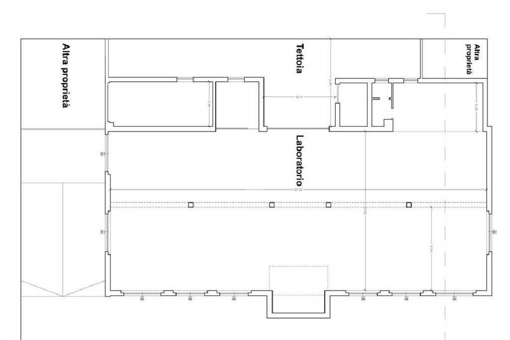 Posto al piano seminterrato l'immobile originale all'epoca di costruzione presenta una zona esterna attualmente coperta da tettoie, inoltre la struttura è libera parzialmente da due lati per la presenza delle rampe per l'accesso carraio. Pavimento in cemento.